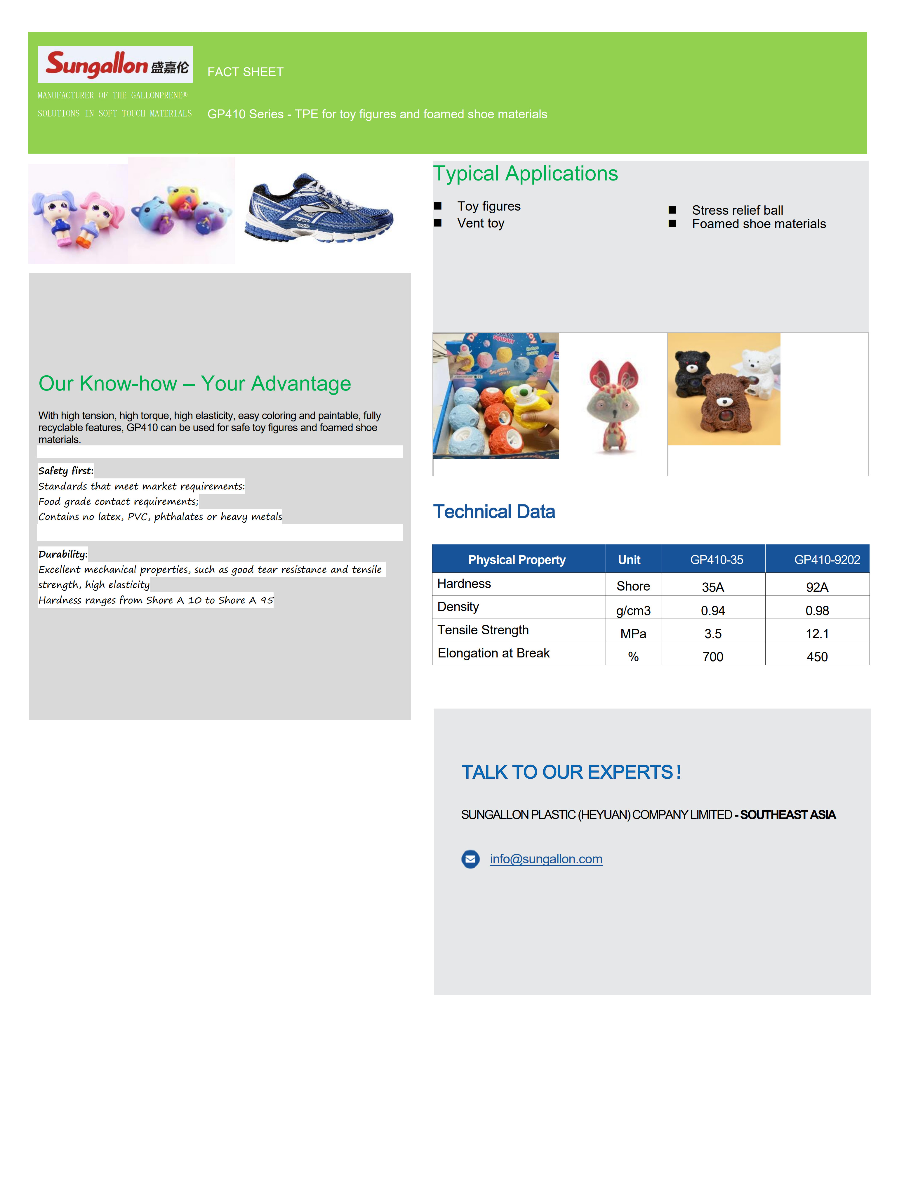 The materials comply with global toy safety standards and has a wide range of hardness, from 10A to 90A, and density from 0.94 to 0.98