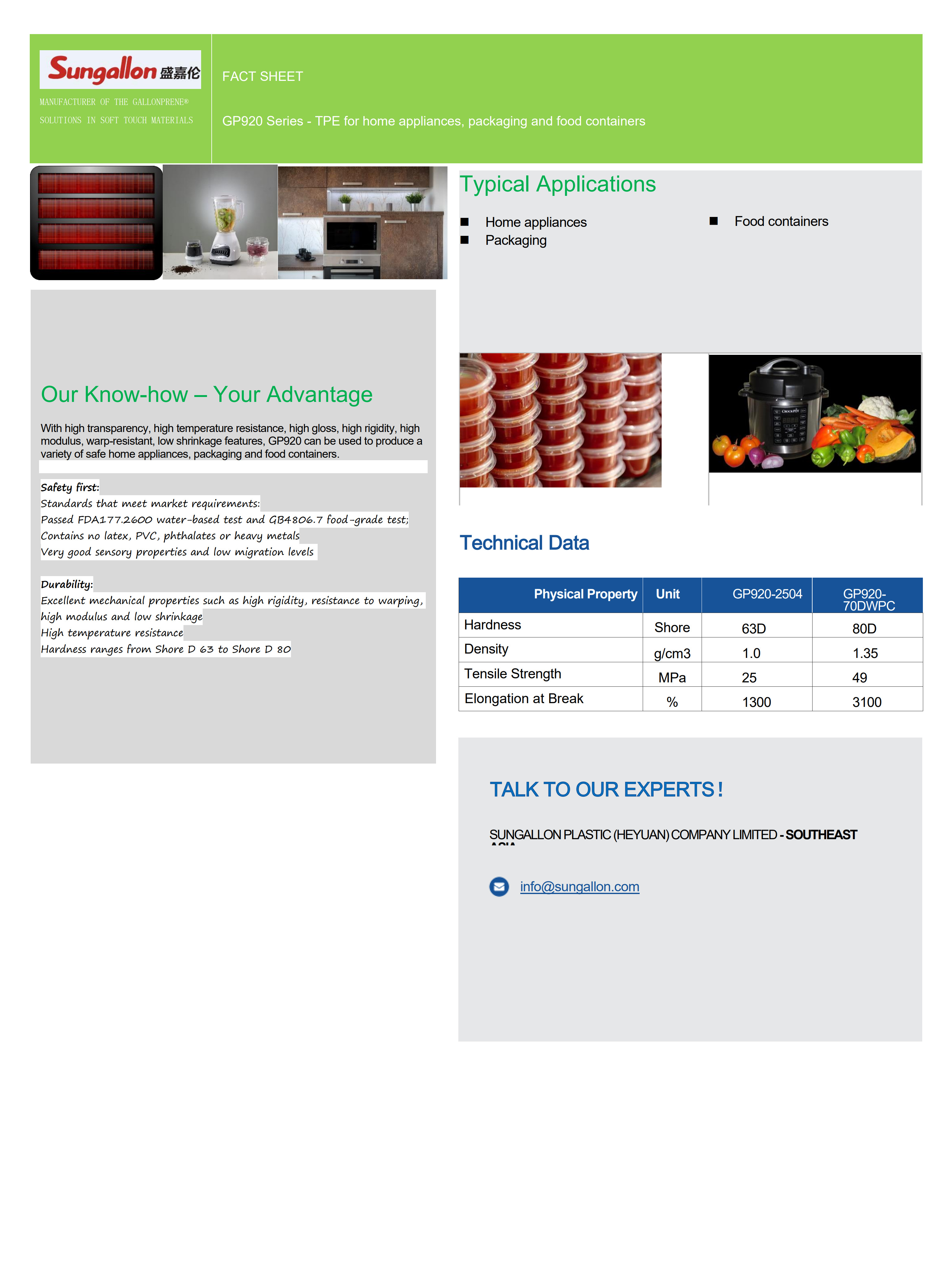 The materials comply with food contact standards and has a range of hardness from 63D to 80D and density from 0.90 to 1.1