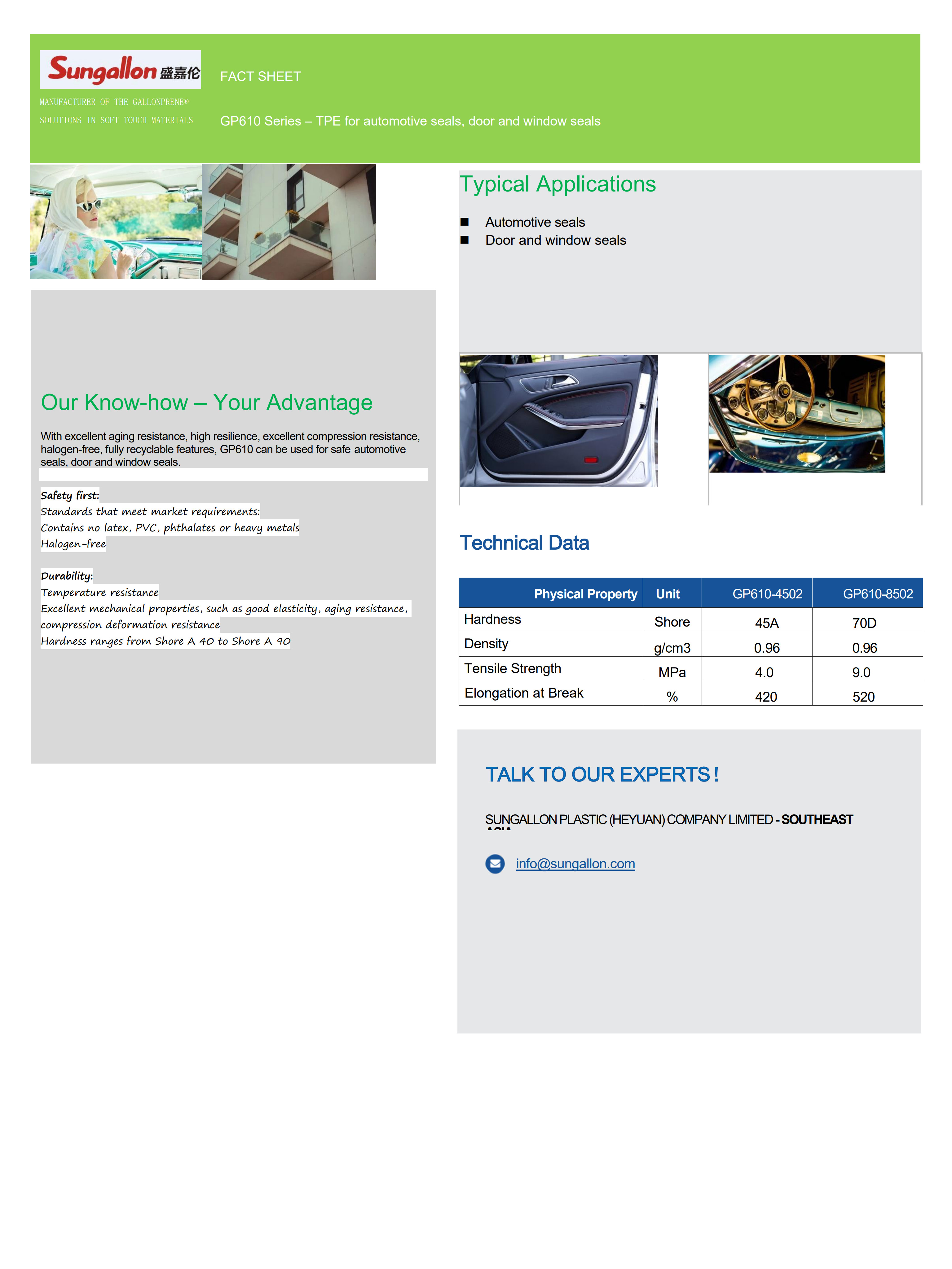 材料符合全球消费产品、工业产品和汽车产品安全标准,硬度范围从40A到90A,密度0.96左右